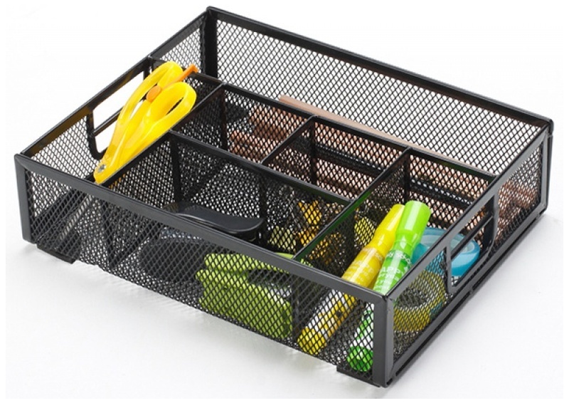 Przybornik na biurko, wykonany z metalowej siateczki powlekanej lakierem 1 przegroda na korespondencję 2 komora na artykuły piśmienne 2 komory na drobne akcesoria biurowe (gumki, spinacze, itp.) 1 komora na karteczki 1 szyfladka na drobne akcesoria posiada gumowe nóżki wymiary: 220x140x130mm...