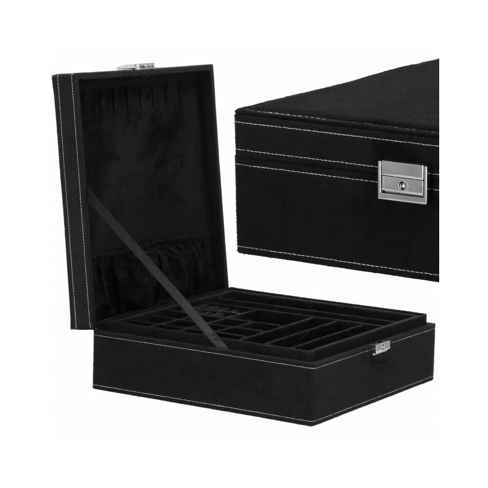 Šperkovnice Vám umožní pohodlné a bezpečné uložení různých druhů prstenů, řetízků, náramků, broží a dalších doplňků. Nabízený velurový kufr značky Springos obsahuje četné přihrádky, ve kterých můžete třídit cenné předměty. Bílé prošívání dokonale ladí s černou krabičkou. Organizér je malý, díky čemuž je ideální na cesty a má promyšlený design, díky němuž najde každá cennost své místo. Rozměr je 26x26x9 cm.