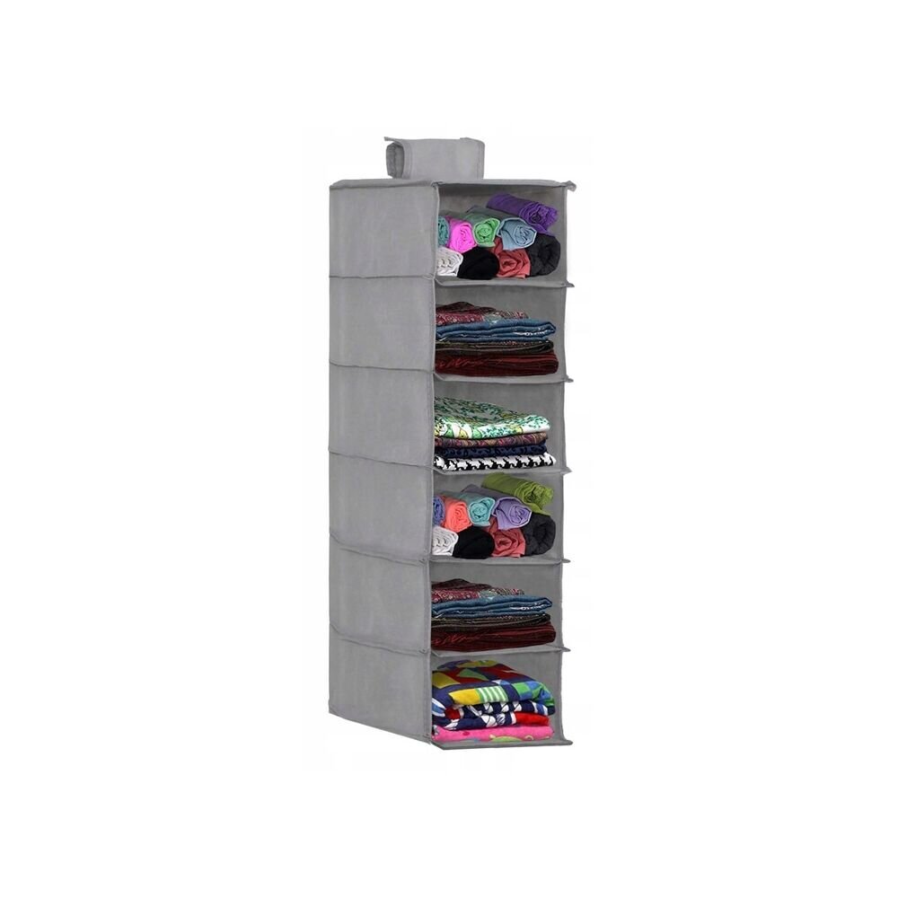 Závěsný organizér / regál s 6 policemi a poutkem na uchycení je výborný doplněk pro šatní skříň, do ložnice, koupelny nebo dětského pokoje. Kompaktní skládací provedení se zesílenými dnem každé police. Rozměry 30x30x120 cm.