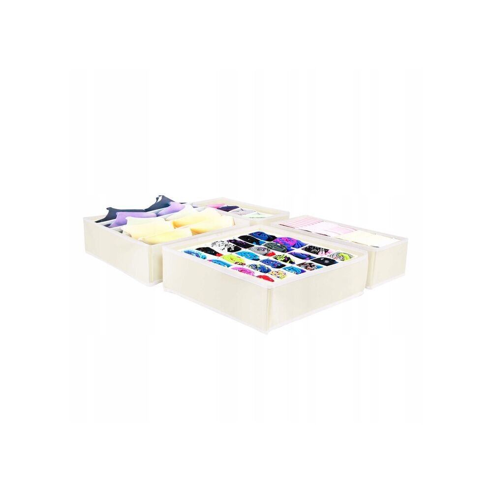 Výhodná sada 4ks praktických organizérů obsahuje 2 větší a 2 menší textilní boxy. Vhodné pro uložení spodního prádla, ponožek, kosmetiky a dalších věcí. Kompaktní skládací provedení se zesílenými boky.