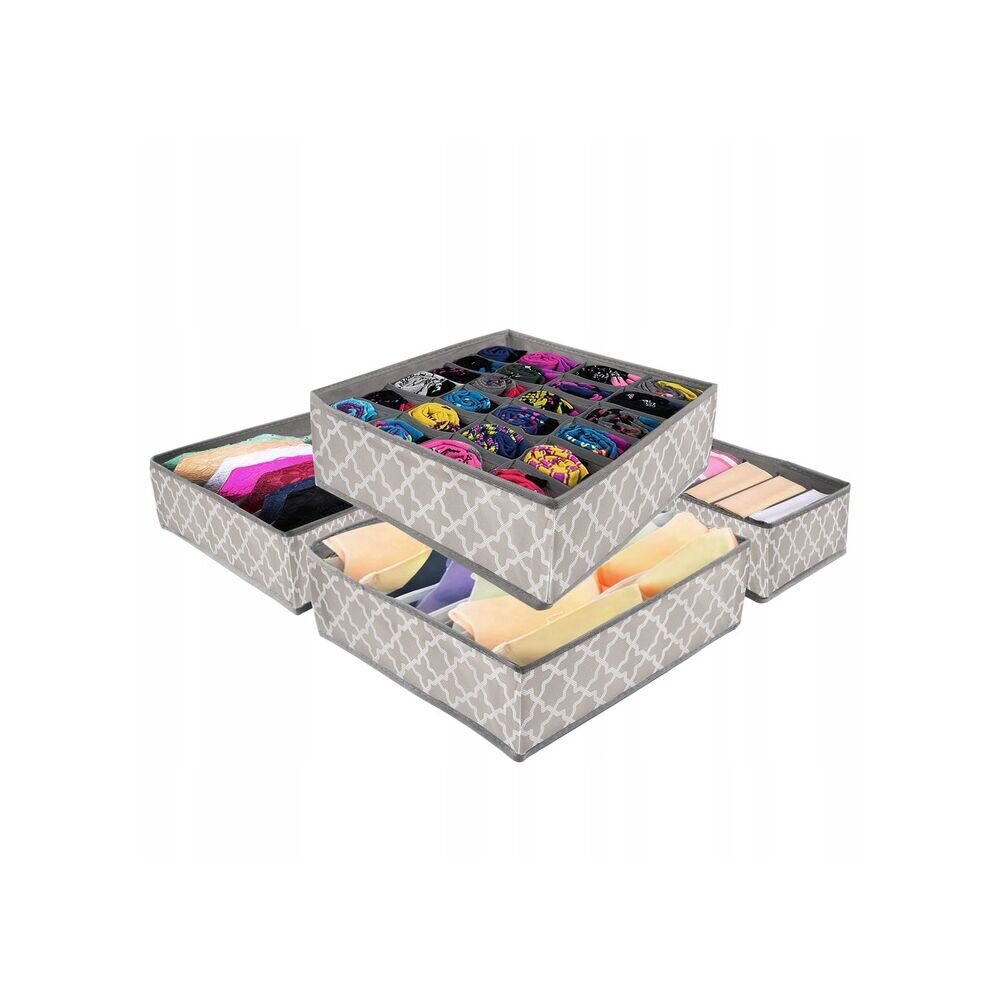 Výhodná sada 4ks praktických organizérů obsahuje 2 větší a 2 menší textilní boxy. Vhodné pro uložení spodního prádla, ponožek, kosmetiky a dalších věcí. Kompaktní skládací provedení se zesílenými boky.