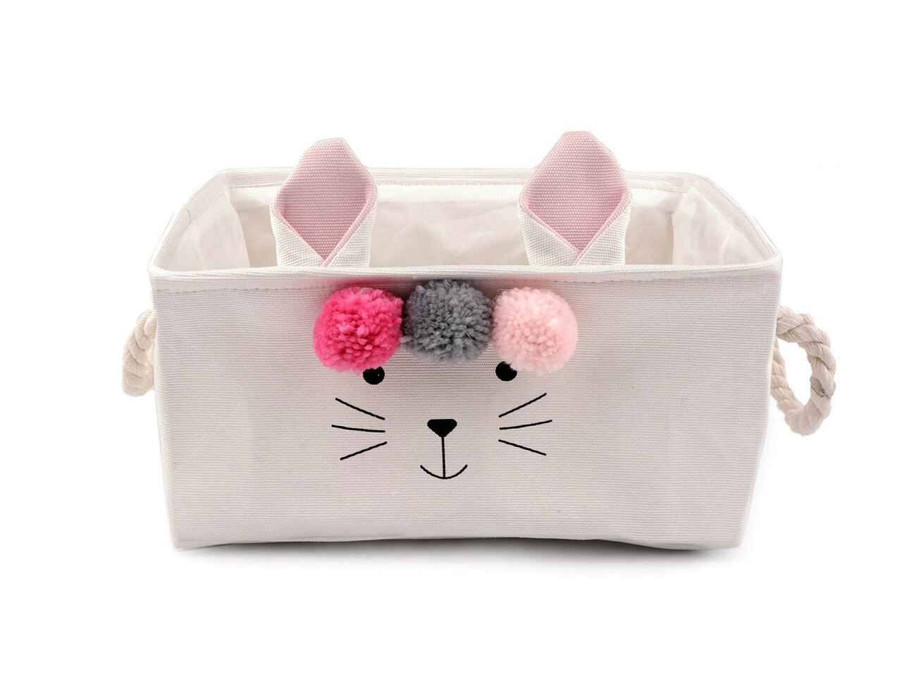 Úložný bavlněný koš v podobě králíčka má široké možnosti použití. Díky bambulek a vyčnívajících uší jej budou milovat především děti a různě velké slečny. Dá se využít jako úložný prostor na různé předměty. Je vyztužený, má ucha do ruky, která jsou praktická na přenášení. Stane se praktickým doplňkem nejen do dětského pokoje.