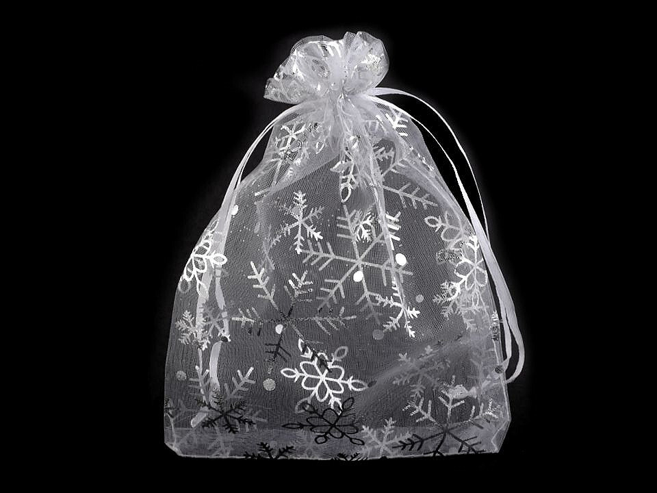 Dárkový pytlíček je vyrobený z organzy a zdobí ho sněhové vločky. Snadno se uzavírá pomocí dvou stahovacích šňůrek.Do pytlíku skryjete drobné dárky nejen na narozeniny, ale také na Vánoce.