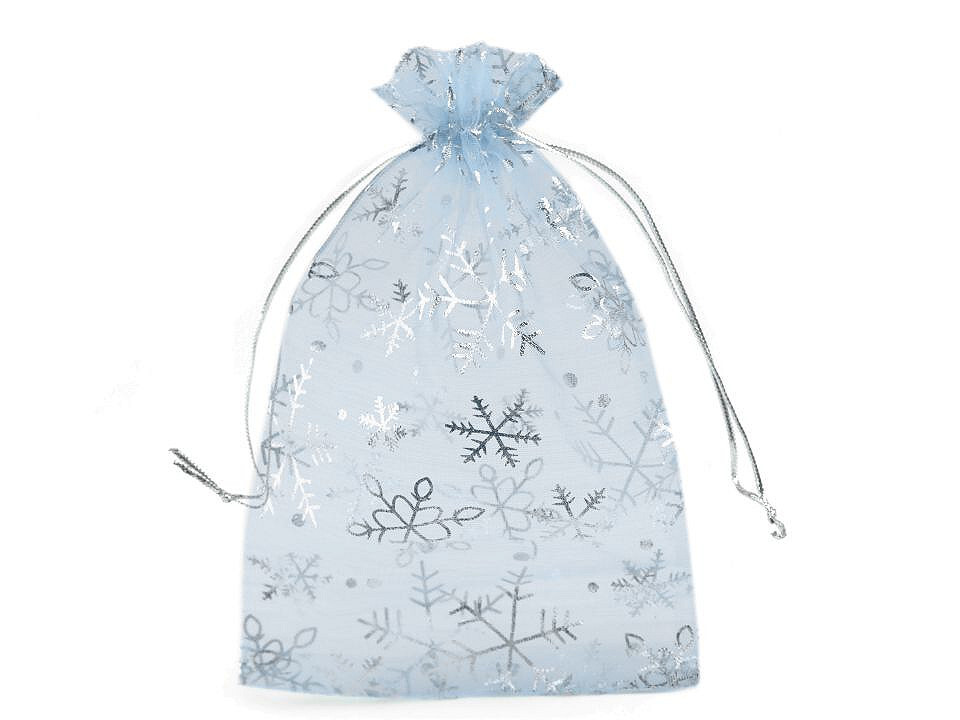 Vánoční dárkový pytlík vločky 13x18 cm organza - 10 ks - 5 modrá ledová stříbrná