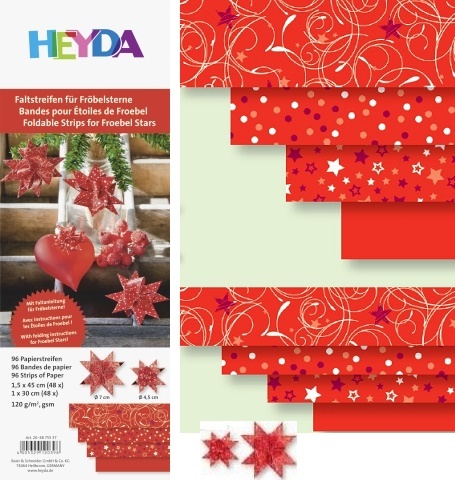 Sada skládacích proužků na výrobu až 24 hvězd o průměru 4,5 cm a průměru 7cm, obsahuje i návod na složení. Balení: 96 proužků se čtyřmi motivy, potištěné oboustranně 120g/m2. Ve 2 velikostech 1cm x 30cm, 1,5cm x 45cm. číst celé