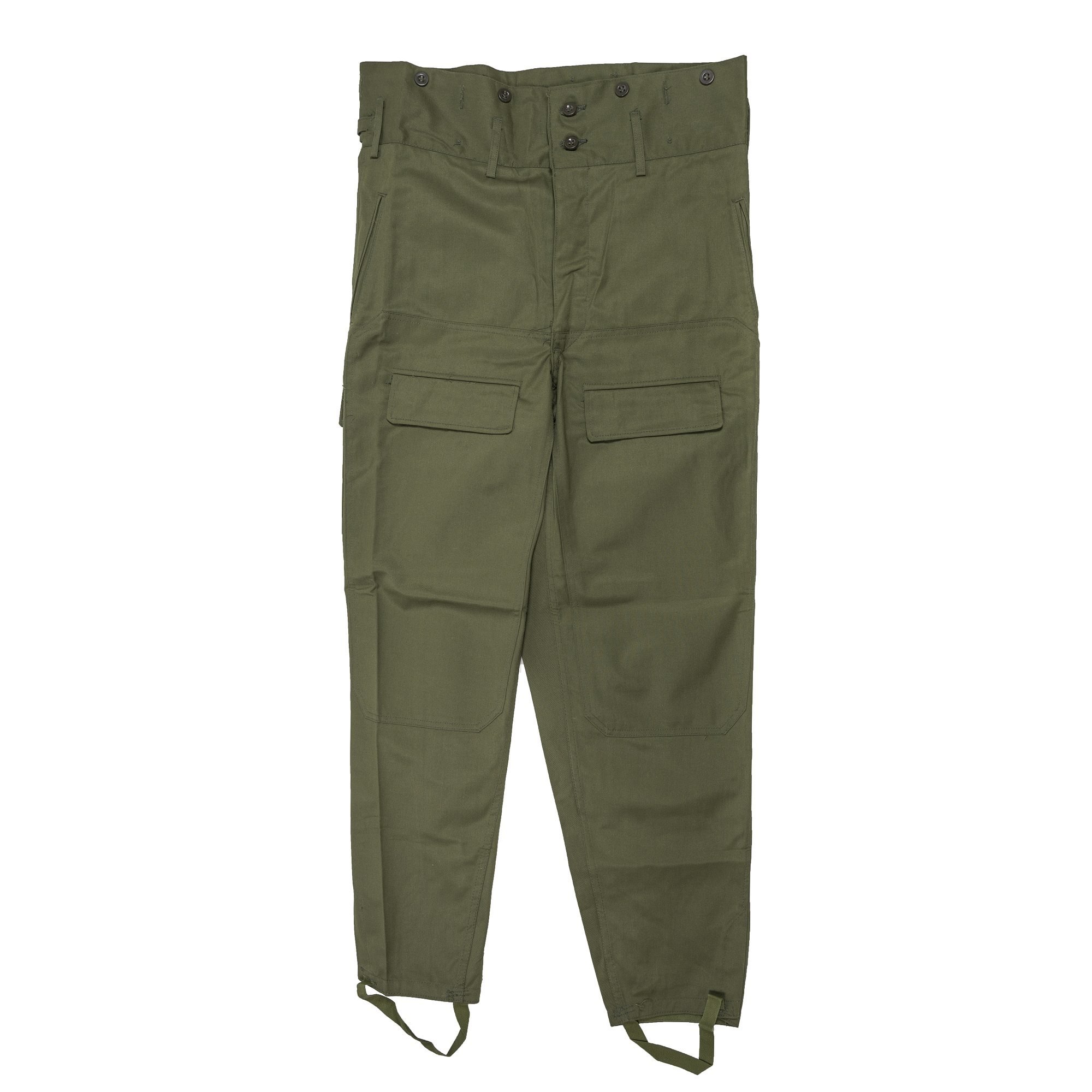 Nové kalhoty z výprodeje AČR. Vzor 85. Zvýšený sed. Zapínaní na knoflíky. Dvě boční velké skládané stehenní kapsy s klopou na knoflíky. Dvě zadní kapsy. Dvě kapsy na ruce. Tkanice na stažení nohavic.