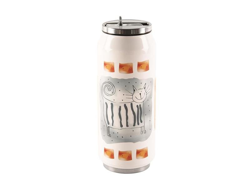 Termoska barevná s dekorem KOČKA ve tvaru plechovky je velice zajímavá a nápaditá svým tvarem. Udrží až 12 hodin teplou a 6 hodin studenou vodu. Čím více je naplněná, tím lépe plní svou funkci. Maximum plnění je však 90 %. Před plněním nalijte do termoplechovky horkou vodu pro teplé nápoje a studenou vodu pro studené nápoje. Nádoba tak přijme teplo nebo se naopak ochladí. Po cca 5 minutách tuto vodu vylijte a naplňte termoplechovku nápojem. Výklopné plastové pítko ve víčku termosky. Víčko na závit se silikonovým těsněním. Materiál: nerezová ocel, plast. Rozměry: objem 0,4 l, pr. 6,5 cm, v. 17 cm. Náhradní díly: víčko 180618, ventil 180621, brčko 180619 (nutno zkrátit-ostřihnout).