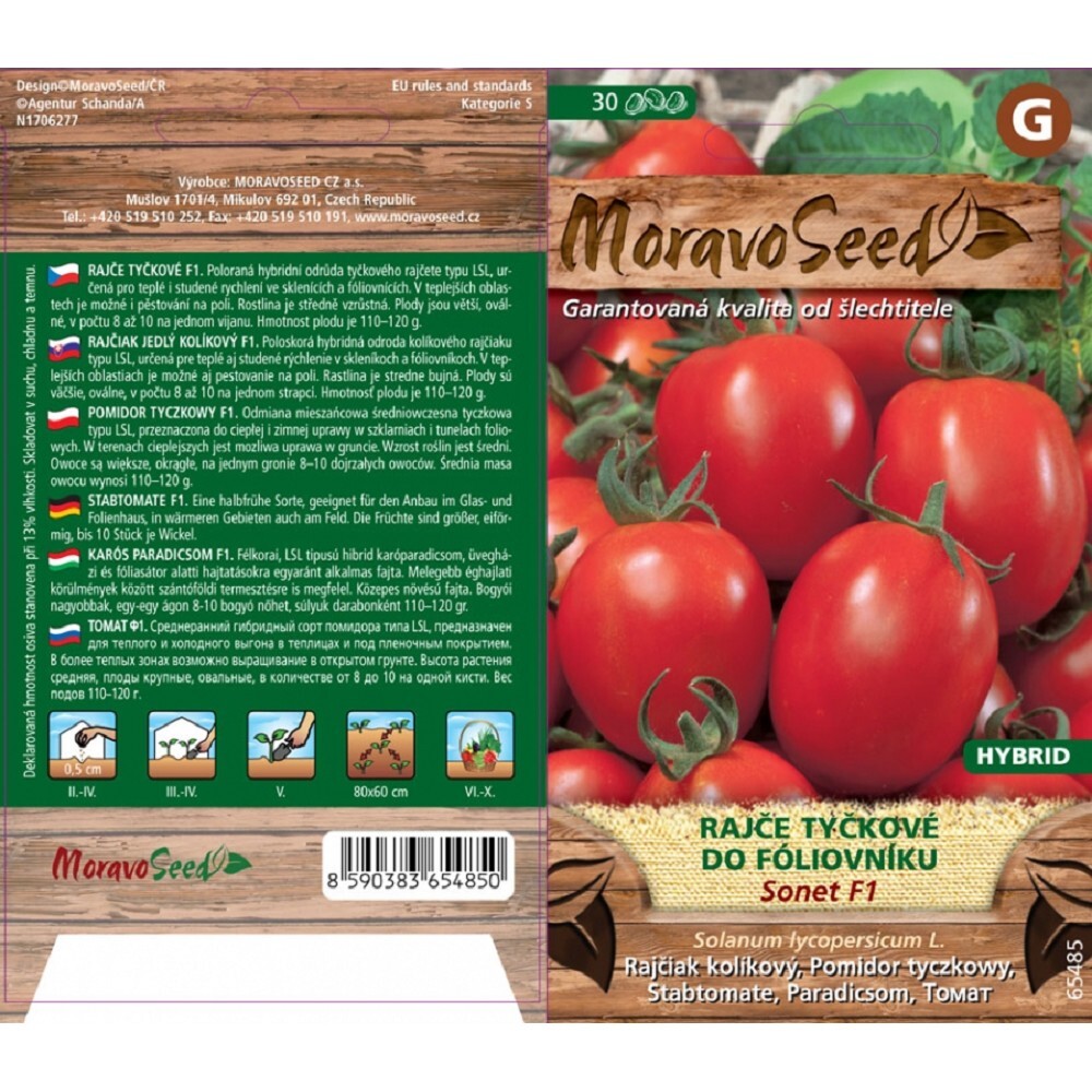 Solanum lycopersicum L.SONET F1 Poloraná hybridní odrůda tyčkového rajčete typu LSL, určená pro teplé i studené rychlení ve sklenících a fóliovnících. V teplejších oblastech je možné i pěstování na poli. Rostlina je středně vzrůstná. Plody jsou větší, oválné, v počtu 8 až 10 na jednom vijanu. Hmotnost plodu je 110 - 120 g.Obsah: