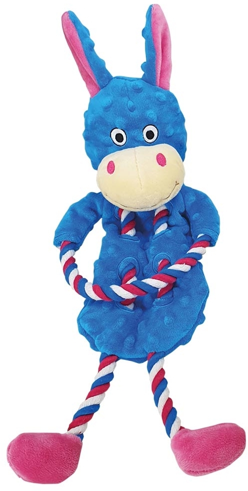Hračka pro psy ke kousání a zábavu. Osel v modré barvě a celkovým rozměrem 47 cm. Hračka je ideální pro psy, kteří chtějí hrát a mazlit se. Je ideální k mazlení a lano je určené k tahání a hraní. Hračka disponuje silným lanem, čímž pes při kousání tuto hračku rychle nezničí. Hračka obsahuje pískátko. Celková velikost: 47 cm Materiál: kvalitní plyš, lano Upozornění: Stejně jako u jiných hraček pro psy by si i s touto hračkou mělo zvíře hrát pod dohledem páníčka nebo jiné zodpovědné osoby. Prosíme dbejte na to, aby hračka, s kterou si Váš pes hraje, byla nepoškozená. Stav hračky pravidelně kontrolujte. V případě, že je hračka poškozena nebo jí již chybí některé součásti, tuto hračku prosím nahraďte. Zamezíte tak případnému zranění Vašeho psa