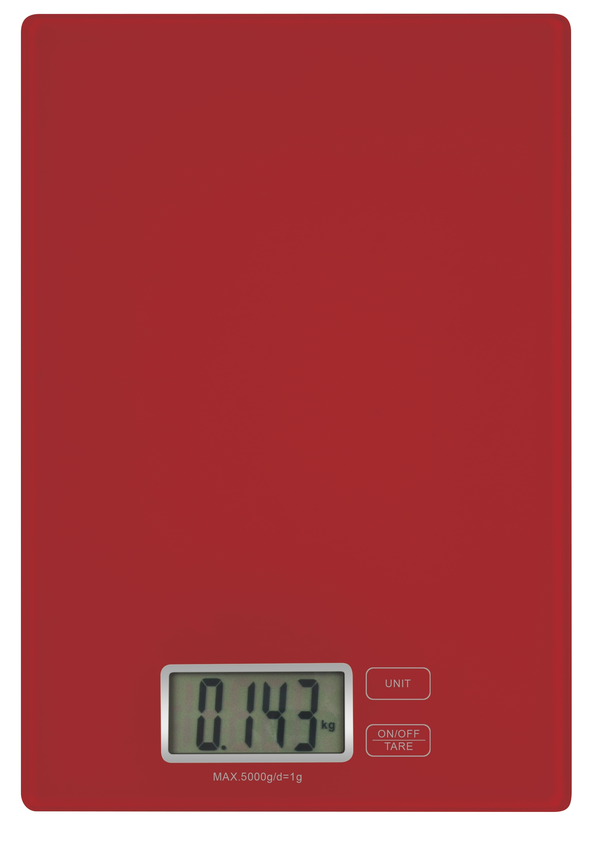 automatické vypnutí: po 2 minutách|barva: červená|Bluetooth: ne|BMI index - měření tuku, vody a svalové hmoty: ne|funkce dovažování: ano|indikace slabých baterií: ano|indikátor přetížení: ano|jednotky váhy: g, oz, lb, kg|LCD displej: ano|max. zátěž: 5 kg|napájení: 1× 3 V CR2032 (součástí balení)|paměť: ne|podsvícený displej: ne|povrch váhy: tvrzené sklo|přesnost vážení: 1 g|prodejní obal: 1 ks, krabička|produkt: kuchyňská váha|rozměr: 15 × 152 × 219 mm
