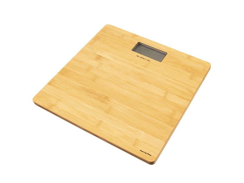 Váha osobní digitální je opatřena plochou z bambusového dřeva. Nosnost 180 kg, možnost vážení v kg, lb a st, velký čitelný displej, zapínání automaticky šlápnutím na plochu váhy, indikátor slabé baterie a přetížení váhy.