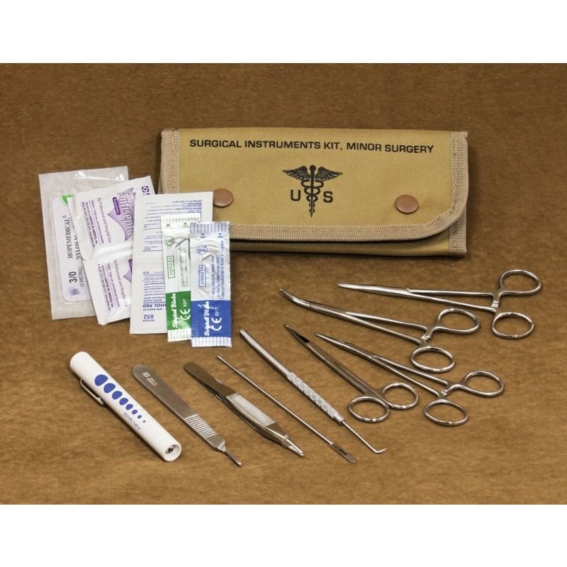 US chirurgický set, který obsahuje 12 různých lékařských nástrojů plus další příslušenství. Vše uloženo v plátěném pouzdře. Materiál jednotlivých nástrojů - nerezová ocel. číst celé