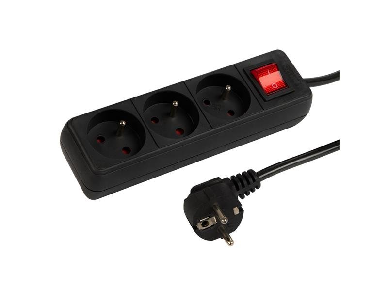 Napájecí kabel PR-370WSP s úhlovou zástrčkou, 3 uzemněnými zásuvkami a vypínačem.