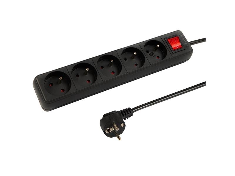 Napájecí kabel PR-570WSP s úhlovou zástrčkou, 5 uzemněnými zásuvkami a vypínačem.