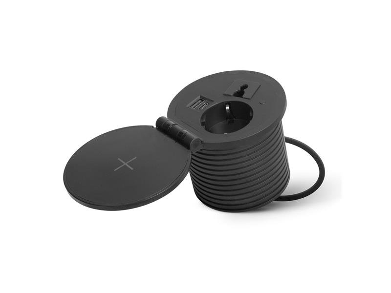 4 v 1 multifunkční, praktický, skrytý zdroj energie, pomocí kterého bude Váš stůl vždy uspořádán a přehledný. Není třeba kabely provádět přes plochu stolu nebo používat prodlužovačky. Můžete ji zabudovat jako jakéhokoli nábytku nebo stolu. USB-A a 1 ks Type-C konektorem.Po odklopení krytu, který chrání zásuvku, najdete bezdrátovou nabíjecí stanici, takže zařízení můžete nabíjet bez připojování kabelů. Díky velkému rozměru není třeba telefon umístit s velkou přesností na nabíjecí stanici. Nepřipojujte další prodlužovačky! Nepoužívejte zakrytě! Jen pro použití v interiéru!