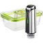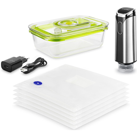 Tato sada obsahuje vakuovací pumpu, praktickou dózu z kvalitního borosilikátového skla, pět opakovaně použitelných zip-lock sáčků a USB kabel pro jednoduché dobíjení. Díky LED indikátorům máte vždy přehled o provozu, a díky Li-ion baterii s napětím 3,7 Vdc je vakuovací pumpa plně přenosná a pohodlná k použití. Nabíjení je snadné přes USB kabel.