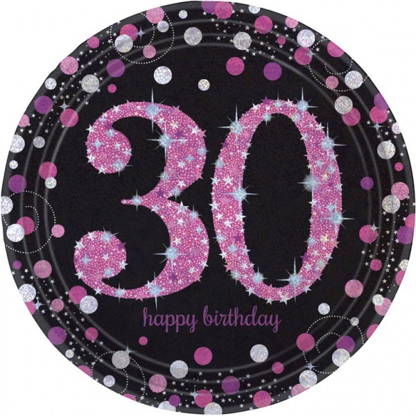 Talerze 23cm 30 urodziny błyszczący różowy op.8szt