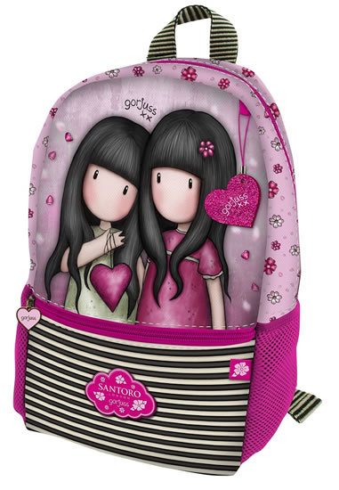 Krásný malý batůžek, který je ideální na výlety, pro každou malou slečnu. Uvnitř je pouze jeden hlavní prostor bez přepážek. Celkově se uzavírá na zip, který je ozdoben malým přívěskem ve tvaru srdce. Na každé boční straně je síťovaná kapsa např. na lahev s pitím. Přední strana je ušita ze třpytivé látky s motivem panenky Gorjuss. Je zde také po celé šířce batohu ušitá kapsa, která se také uzavírá na zip. Zadní popruhy jsou nastavitelné