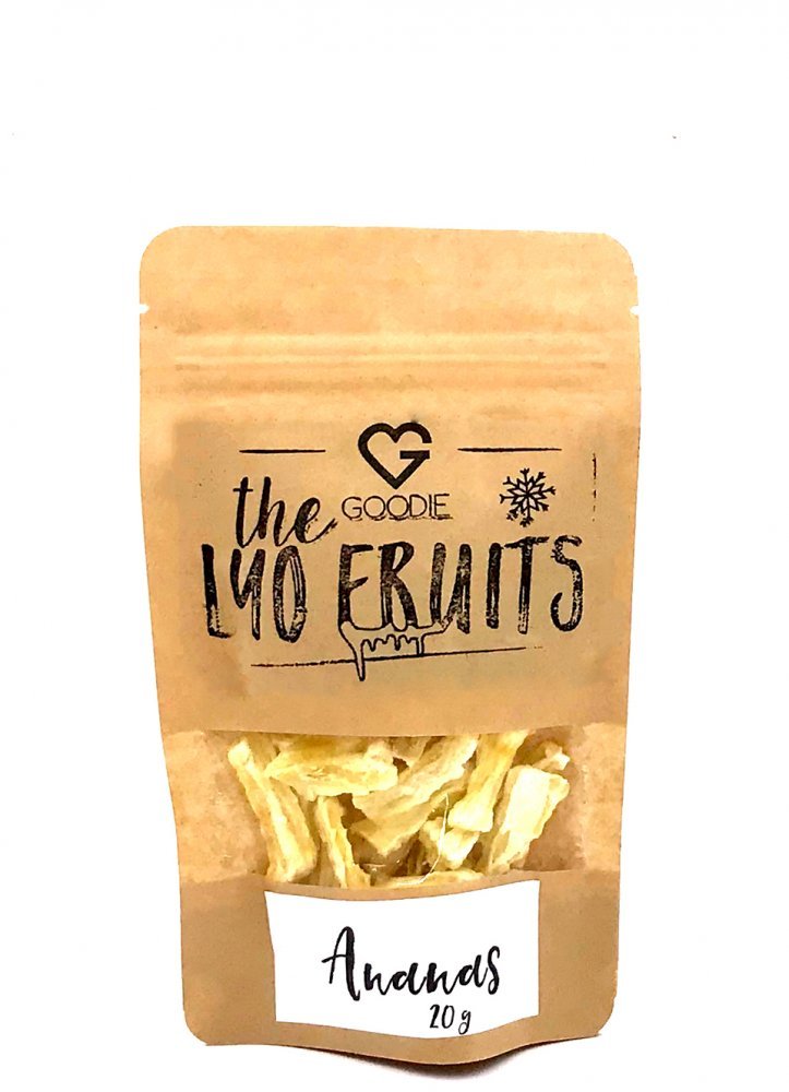 Lyofilizované neboli mrazem sušené kousky ananasu si díky šetrnému zpracování lyofilizací uchovávají většinu původních vlastností jako je vůně, chuť, barva a živiny. Jsou krásně křupavé, lehké a výživné. Lyofilizace: Modernější, efektivnější a sofistikovaný způsob sušení ovoce oproti klasickému je hluboké a rychlé zmrazení ovoce a následné sušení pod nízkým tlakem. Díky tomuto procesu si ovoce zachovává většinu svých původních vlastností jako je chuť, tvar, barva, aroma. Při klasickém sušení se ovoce suší na slunci nebo v sušičkách při vysokých teplotách. Dojde většinou ke změně chuti, barvy, tvaru a v neposlední řadě nutričního profilu. Při lyofilizaci se zachovávají téměř všechny vitamíny a minerální látky v ovoci, je zbavené všech mikrobiálních nečistot a má delší trvanlivost. Použití: samostatně jako svačina pro děti i dospělé do snídaňových kaší příprava smoothie zdobení při pečení RAW kuchyně Výživové údaje na 100 g: Energetická hodnota: 1591 kJ / 376 kcal Tuky: 0,85 g
