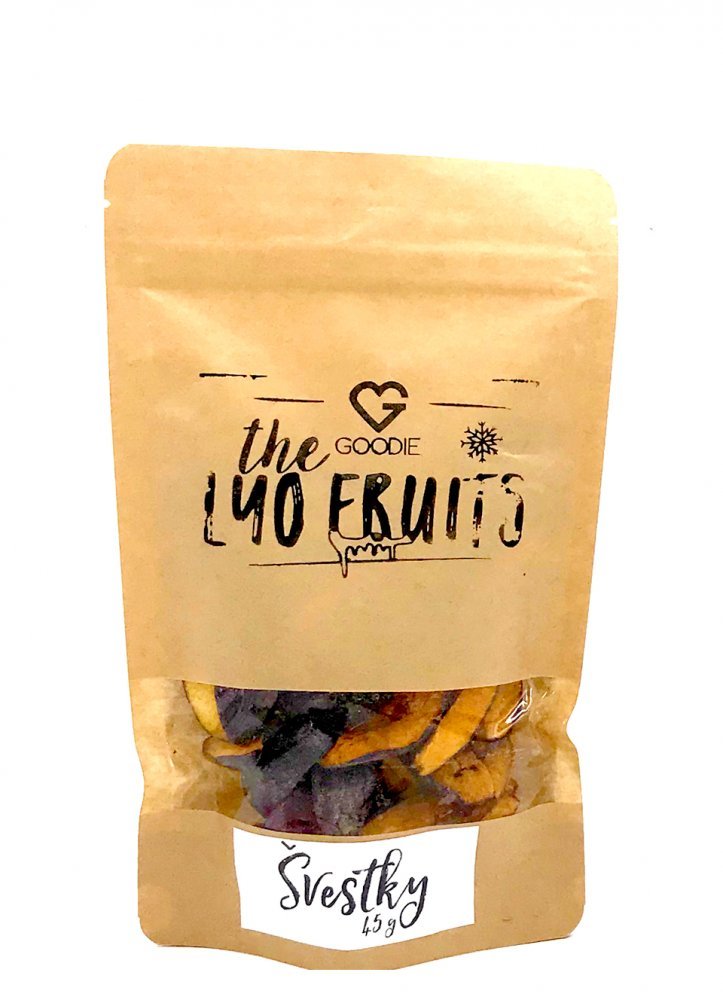 Lyofilizované neboli mrazem sušené plátky švestek si díky šetrnému zpracování lyofilizací uchovávají většinu původních vlastností jako je vůně, chuť, barva a živiny. Jsou krásně křupavé, lehké a výživné. Lyofilizace: Modernější, efektivnější a sofistikovaný způsob sušení ovoce oproti klasickému je hluboké a rychlé zmrazení ovoce a následné sušení pod nízkým tlakem. Díky tomuto procesu si ovoce zachovává většinu svých původních vlastností jako je chuť, tvar, barva, aroma. Při klasickém sušení se ovoce suší na slunci nebo v sušičkách při vysokých teplotách. Dojde většinou ke změně chuti, barvy, tvaru a v neposlední řadě nutričního profilu. Při lyofilizaci se zachovávají téměř všechny vitamíny a minerální látky v ovoci, je zbavené všech mikrobiálních nečistot a má delší trvanlivost. Použití: samostatně jako svačina pro děti i dospělé do snídaňových kaší příprava smoothie zdobení při pečení RAW kuchyně Složení: 100 % lyofilizované švestky Výživové hodnoty (100 g): Energetická hodnota: 1618 kJ / 385 kcal Tuky: 0,6 g z toho nasycené mastné kyseliny: 0,2 g Sacharidy: 90 g z toho cukry: 61 g Bílkoviny: 3,7 g Sůl: 0 g