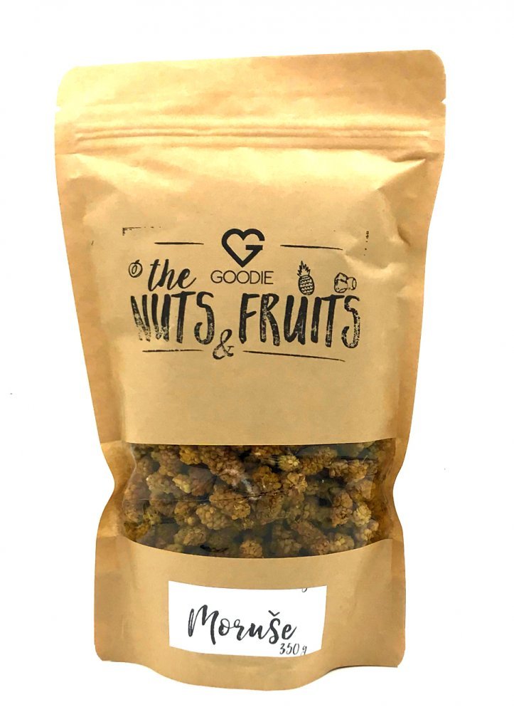 Sušené plody moruše bílé (Morus alba) mají příjemnou medově-sladkou chuť. Obsahují přirozeně vyskytující se cukry a vlákninu, hodí se jako rychlý zdroj energie. Naše sušené moruše jsou bez přidaného cukru a bez ošetření oxidem siřičitým SO2.