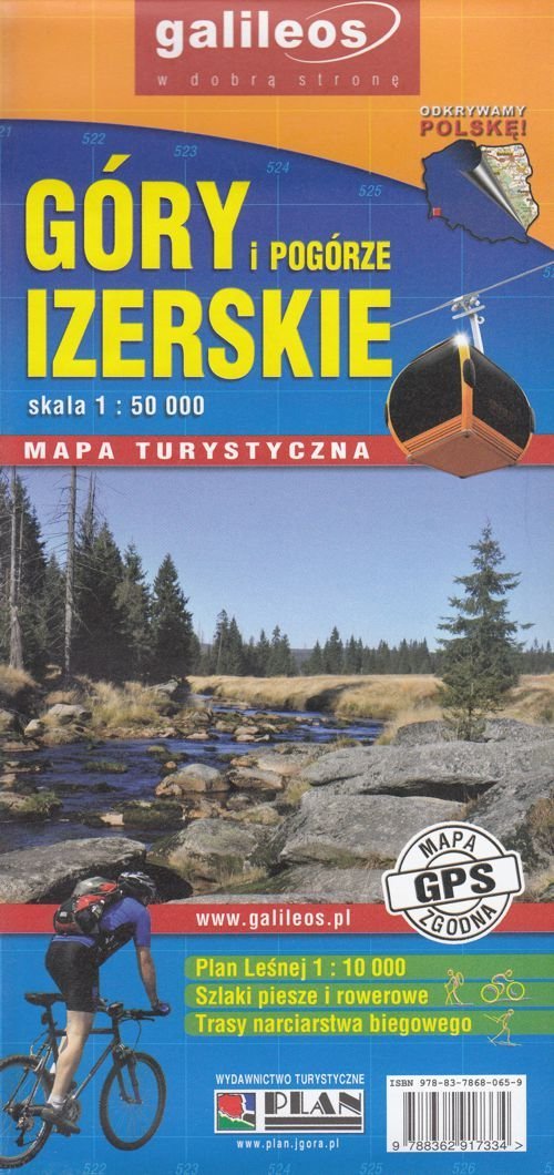 Map turystyczna Gór i Pogórza Izerskiego. Dzięki zastosowaniu skali 1:50 000 na mapie pokazano duży obszar polskiej i czeskiej części gór. Zaznaczono licznie oznakowane szlaki piesze i rowerowe oraz trasy narciarskie. Na rewersie pokazano w skali 1:30 000 ośrodek narciarstwa biegowego w...