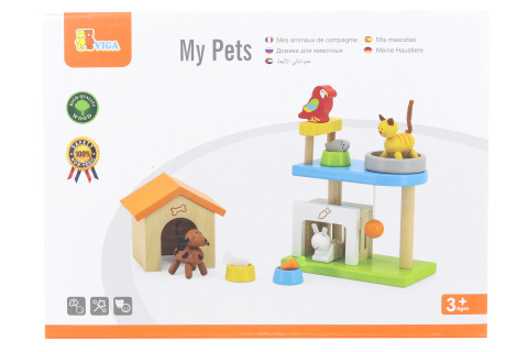 Dřevěná domácí zvířátka. Balení obsahuje pejska, kočku, papouška, králíka a další doplňky o rozměrech cca 11,5 x 15,5 x 6 cm. Rozměr balení cca 24 x 18 x 7 cm. Věk 3+ číst celé