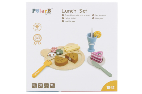 Dřevěná sada na oběd obsahuje talířek, příbor, maso, drink a další doplňky. Rozměry cca 18 x 18 x 9,8 cm. Rozměry balení cca 22,5 x 23 x 6,5 cm. Věk 18m+