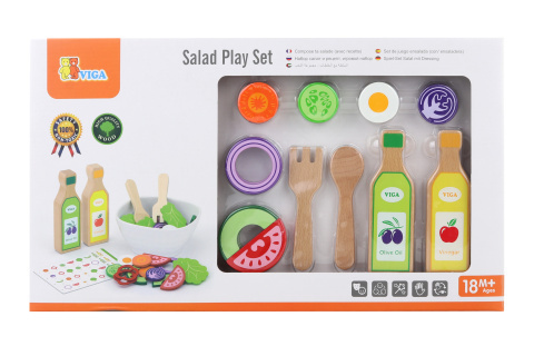 Dřevěná salátová sada obsahuje 36 pečlivě vyrobených kousků, mezi kterými najdete listy salátu, praktickou misku, různou dřevěnou zeleninu a příbory spolu s dalším příslušenstvím. Díky kombinaci realistických tvarů a přírodního materiálu si děti užijí spoustu zábavy při hraní na kuchaře nebo prodejce na trhu.
