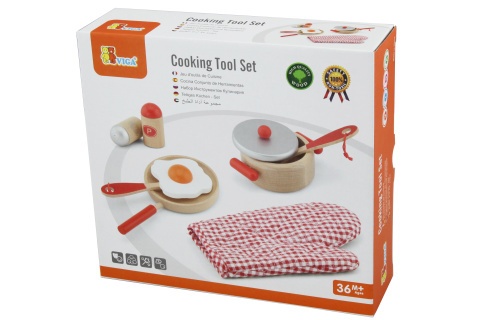 Dřevěná sada nádobí. Balení obsahuje hrnec, pánev, chňapku, vejce a další doplňky. Rozměry balení cca 24 x 22 x 7 cm. Věk 24m+