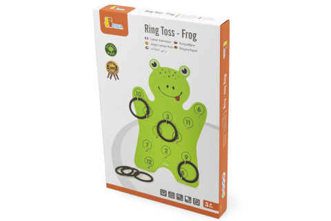 Dřevěná nástěnná hra - házení kroužků. Balení obsahuje dřevěnou žábu o velikosti cca 30 x 45 x 3 cm a 6 kroužku. Rozměry balení cca 30,5 x 45,5 x 4,5 cm. Věk 3+