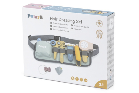 Dřevěná sada kadeřník s opaskem - obsahuje opasek,na který lze upevnit nůžky,hřeben, holicí strojek,fen,kulmu,gumičku s ozdobou,břitvu. Rozměry opasku cca 32 x 12 x 2 cm. Maxi velikost opasku 66 cm,lze zmenšit.Rozměry balení cca 27 x 21 x 5 cm. Věk 3+