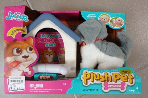 Pejsek s doplňky. Napájení na 2 AA baterie, které nejsou součástí balení. Po zapnutí pejske štěká, chodí a vrtí ocáskem. Balení obsahuje pejska, boudu a kostičku. Materiál plast+plyš. Baleno v krabici. Rozměry balení cca 29x19x17 cm. Velikost pejska 17x15 cm. Věk 3+ číst celé