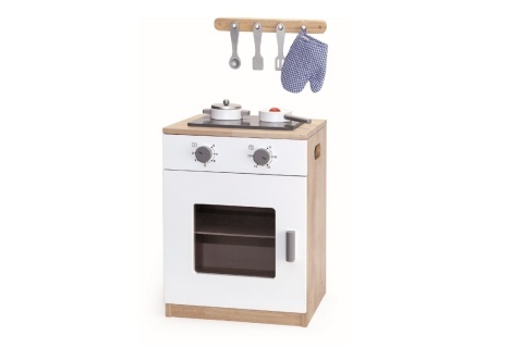 Dřevěný sporák s doplňky. Balení obsahuje sporák, troubu, hrnec, pánev, chňapku a další doplňky. Rozměry cca 40 x 56 x 36 cm. Baleno rozložené v krabici. Věk 3+ číst celé