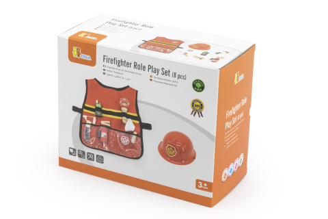 Hasičský set obsahuje látkovou vestu, plastovou helmu a 6 dřevěných hasičských pomůcek. Rozměry balení cca 24,5x20x12 cm. Rozměry vesty 41x45,5 cm. Rozměry helmy 21x19x10 cm. Věk 3+ číst celé