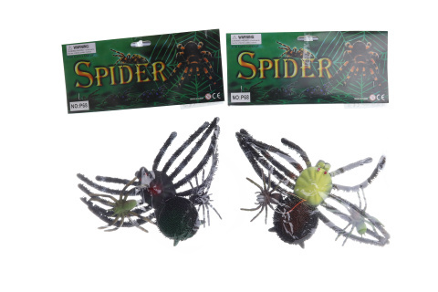 Gumový pavouk o velikosti cca 30 x 15 x 3 cm, který po zmáčknutí zadečku píská. Součástí balení jsou také 2 menší pavouci. Rozměry balení cca 25 x 34 cm. Věk 3+