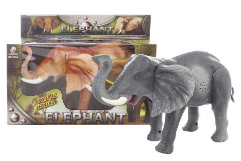 Plastový slon o velikosti cca 28 x 15,5 cm, který sám chodí, pohybuje chobotem a ocasem a vydává zvuky. Provoz na 3 AA baterie (nejsou součástí). Rozměry balení cca 30 x 22 x 13 cm. Věk 3+ číst celé