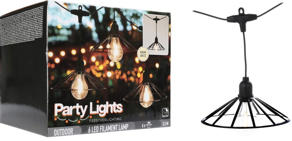 LIGHT CHAIN WITH 6 BULBS, WITH BLACK PLASTIC SHADE, EACH BULB WITH 1 FILAMENT, PLASTIC BULB, CABLE IN BLACK COLOUR, LEADWIRE: 3M, BULB DISTANCE: 50CM, LENGTH EXCL LEADWIRE 2,5M, ROUND RUBBER CABLE, IP44 ADAPTER, WITH TIMER 31V 3.6W, PACKED IN COLOUR BOX/ 300X260X250MM, Colour Box (CLB): WEEE /...