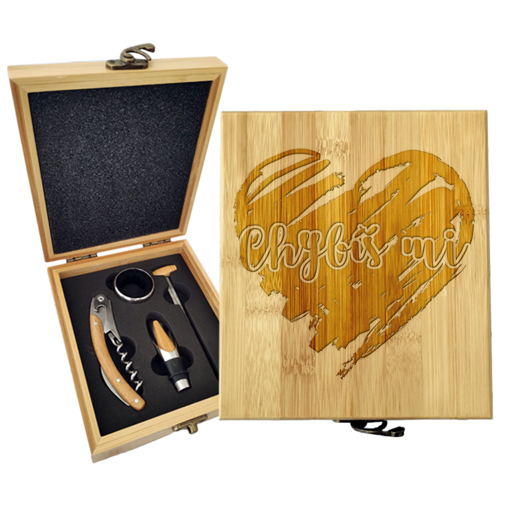 Dárková sada na víno v dřevěné krabičceIdeální dárek pro každého milovníka vína je dřevěná krabička se sadou na víno s originálním gravírovaným věnováním.Sada obsahuje 4 kusy a krabička je vyrobená z bambusu.Rozměry: 147×168×49 mm číst celé
