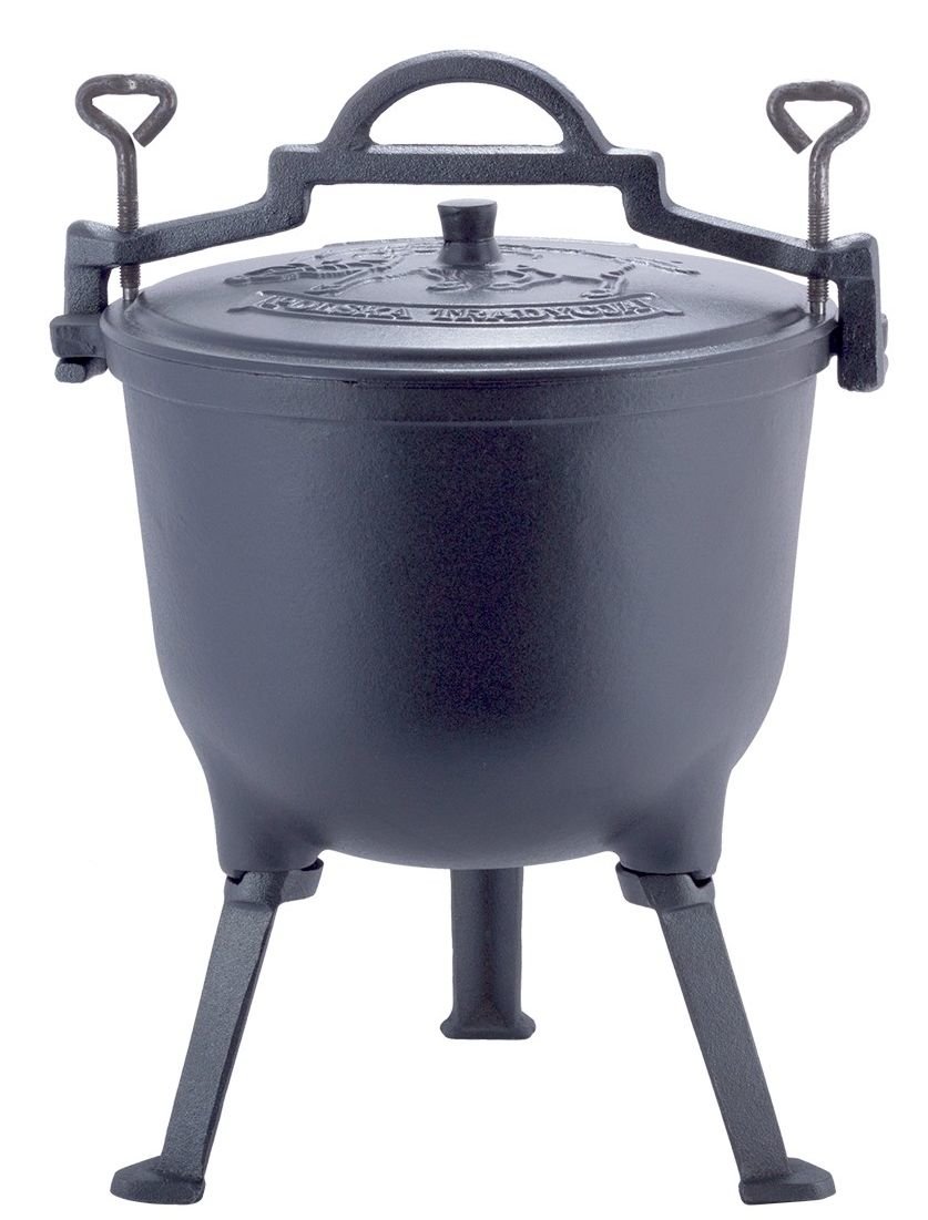 Kotlík vyrobený z vysoce kvalitní litiny - přírodní materiál, bez chemických přísad. Zevnitř pokrytý smaltovaným povrchem. Odvzdušnění pro regulaci tlaku na bezpečnou úroveň. Dokonale vede teplo, které se rovnoměrně šíří po celé ploše kotle. Odšroubovatelné nohy umožňují použití v různých zdrojích tepla. Lze je zavěsit nad oheň. Praktická rukojeť pro nošení nebo zavěšení. Řádně udržované (namazané) vydrží mnoho let. Umývat pouze ručně - není vhodné