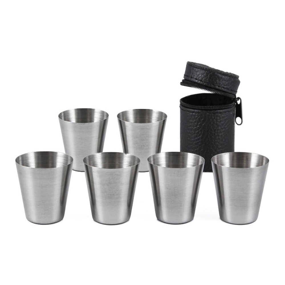 Souprava nerezových panáků v kovovém pozdře, 6 ks