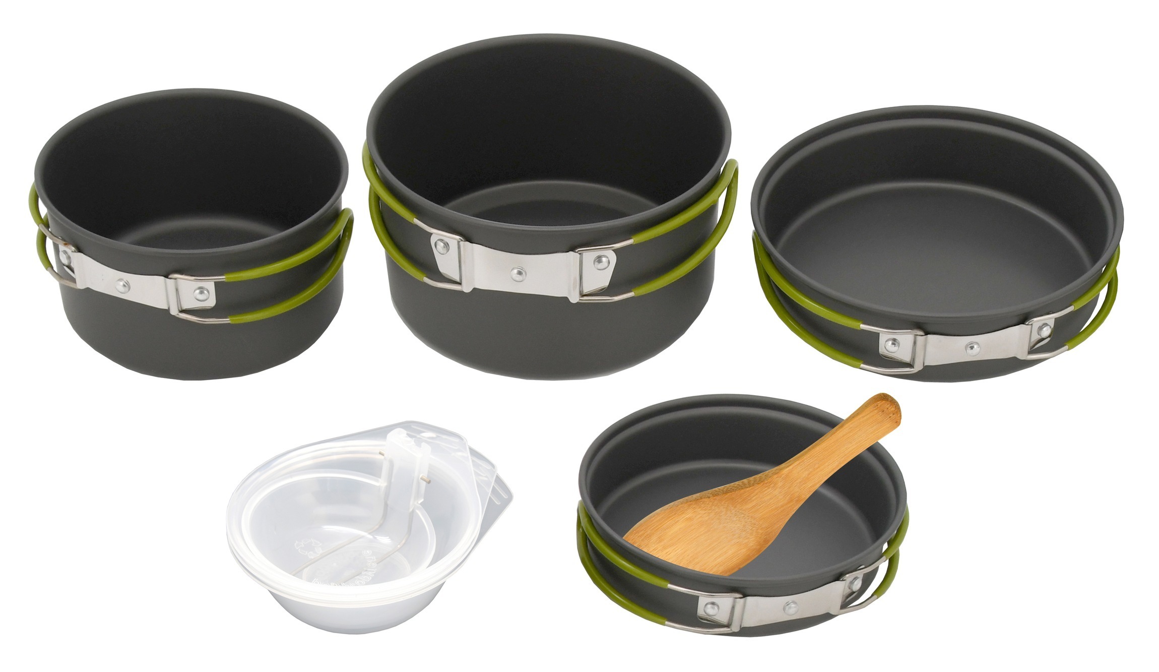 Sada outdoorového nádobí v provedení z anodizovaného hliníku. Sada je tvořena kotlíky s rozměry 17 x 8,5 cm; 14,5 x 8 cm a pánvičkami, které mohou plnit i funkci pokličky, nebo kastrolu o rozměrech 18 x 4,5 cm; 15 x 4 cm. Veškeré vybavení je opatřeno sklápěcím držákem opatřeným silikonovými návleky pro usnadněnou manipulaci. Dalšími součástmi jsou 13 cm vařečka, skládací naběračka, 3x miska 11 x 4 cm a drátěnka na mytí nádobí. Jednotlivé části sady jsou rozměrově přesně odstupňovány a dají se tak složit dohromady, čímž ušetří spoustu místa. Navíc je vše uloženo v praktické sítěné tašce. Sada je vhodná při turistických a dalších outdoorových aktivitách, kdy chceme zajistit patřičný komfort a zároveň ušetřit místo a váhu zavazadel.