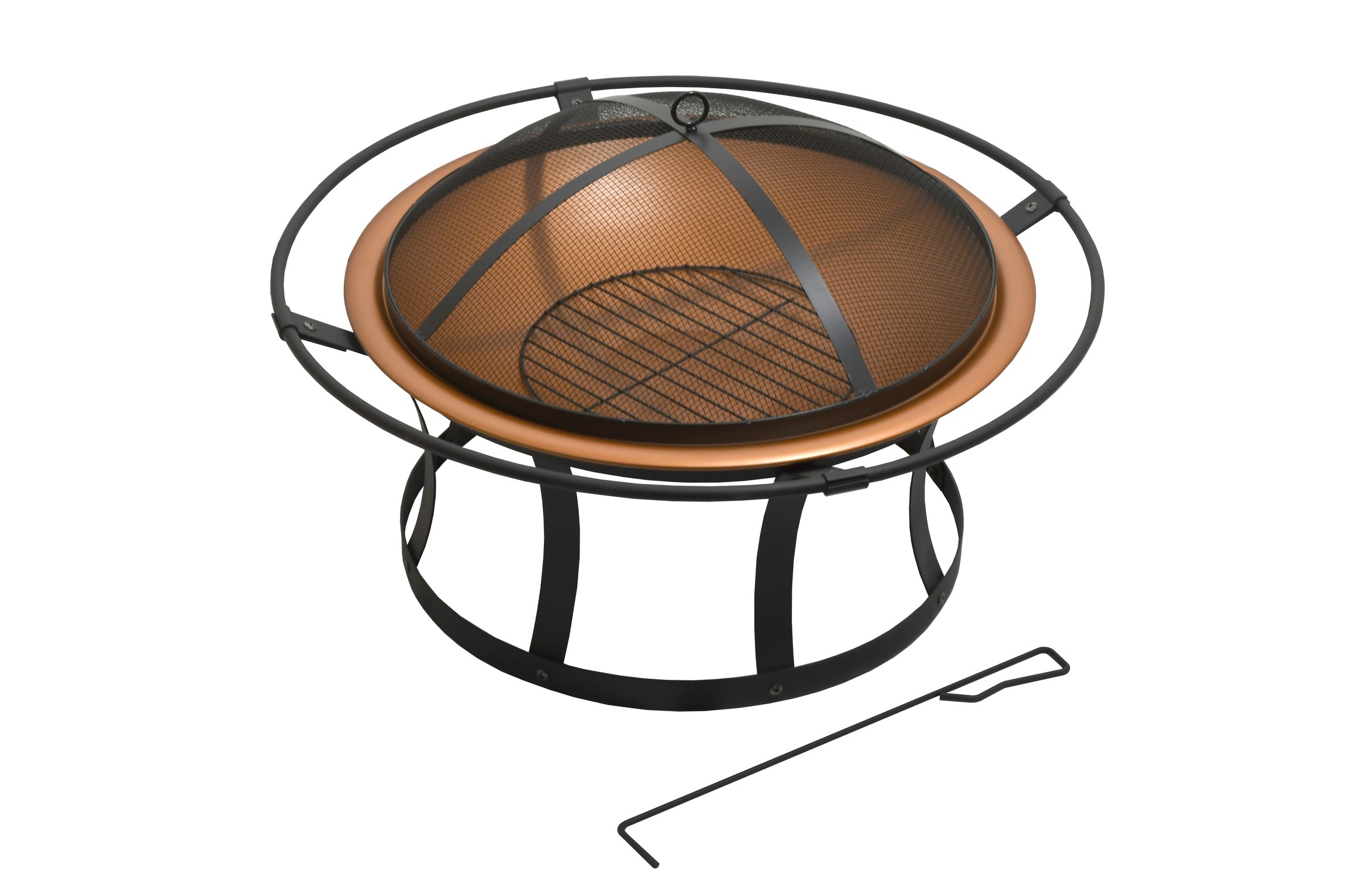 Speciálně tvarovaný poklop s pletivem poslouží jako ochrana před jiskrami, což výrazně zvyšuje bezpečnost a pohodlí. Přiložen je i kovový pohrabáč s dřevěnou rukojetí, který lze použít jak k urovnání ohně, tak i k snadnému sundání poklopu.