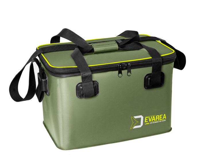 Taška Delphin EVAREA Large s rozměry 50x30x30cm je univerzální plastová rybářská taška obdélníkového tvaru, která poslouží k uskladnění různého rybářského vybavení nebo rybářské bižuterie. Taška je vyrobena z tvrdého EVA materiálu a skvěle drží svůj tvar. Taška je matné army zelené barvy a vybavená je zipem černé barvy, kterým se uzavírá víko nádoby. Na víku se nachází světlezelený lem. Spodní část je vyrobena z nepropustného plastu a v případě, že se vám něco uvnitř rozlije, tuto tekutinu spodní část tašky zadrží. A také, pokud položíte tašku na mokrý povrch, tak nepromokne. Taška je omyvatelná zevnitř i zvenčí. Taška je opatřena černými popruhy pro ruční úchop, a také popruhem přes rameno.