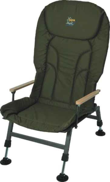 Velké pohodlné rybářské křeslo s vysokou zádovou opěrkou. Polohovatelné opěradlo, nosnost 120kg, váha 6kg, výškově nastavitelné nožičky.