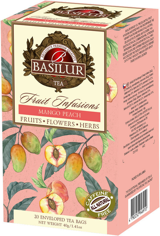 Ovocný čaj, aromatizovaný, porcovanýSložení: ibišek květ 35 %, šípek plod 28,5 %, pomeranč list 12 %, červená řepa 10 %, stévie list 4 %, přírodní aroma (broskev, mango, kyselina citronová) Hmotnost: 40g (20x2g) Návod na přípravu: 1 sáček / lžičku na 250ml šálek, zalít vodou 100°C, louhovat 3-5 minutVýrobce: Basilur Tea Export (PVT) LTD. Baleno na Srí Lance. Dovozce pro ČR: MIX-TEE velkoobchod, s.r.o., Masarykova 235, 250 88 Čelákovice, Česká republikaSkladovat v suchu a chladu.