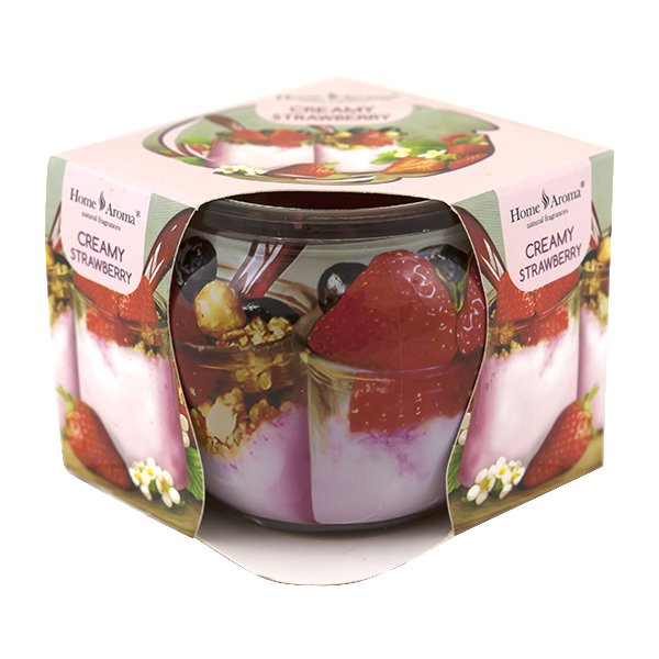 Vonná svíčka dekorativní - vůně Strawberry Cream - 70g dokonalá vonná svíčka vhodná pro navození příjemné domácí atmosféry nebo jako dárek pro blízké či kamarády. Vonné svíčky obsahují 2-5% vonné esence, která navodí úžasnou atmosféru a provoní Váš domov. Svíčky jsou dekorativní jsou ve skleněné nádobě, kterou je po vypálení svíčky možné použít k jiným účelům nebo jako svícen. Pro ideální vypálení svíčky nechte svíčku po 2 hodinách pálení odpočinout a zapalte ji až vosk opět ztuhne. Tímto způsobem docílíte, že se bude vonná esence uvolňovat v plném rozsahu a nebude se přepalovat. V případě, že Vám svíčka nadměrně kouří, je nutné zkrátit knot pomocí nůžek.DOBA HOŘENÍ: 12-16 HODIN