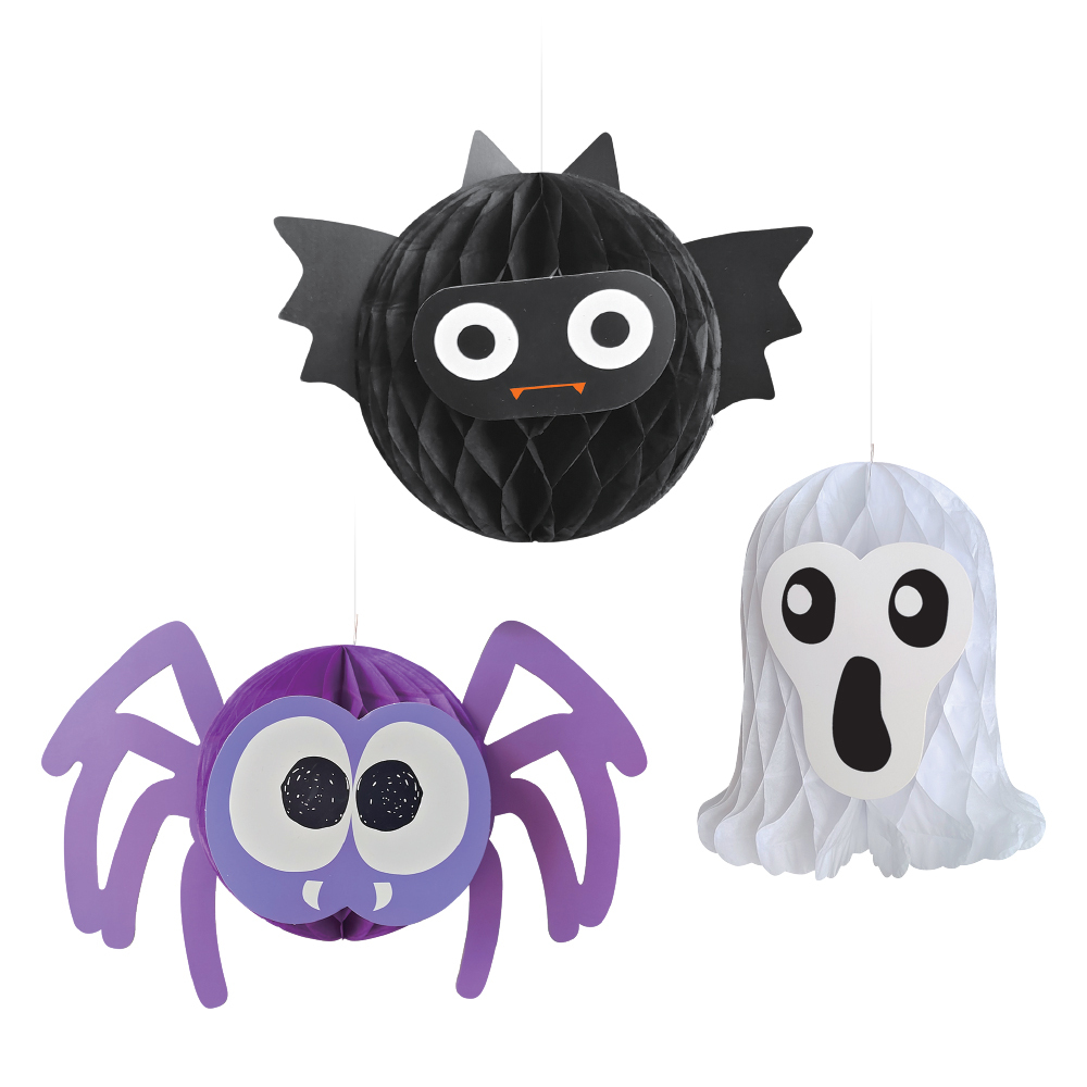 Dekorace papírová Halloween - Duch, Pavouk a Netopýr (3ks), papírová, závěsná. Použití: dekorační účely, večírky a karnevaly.