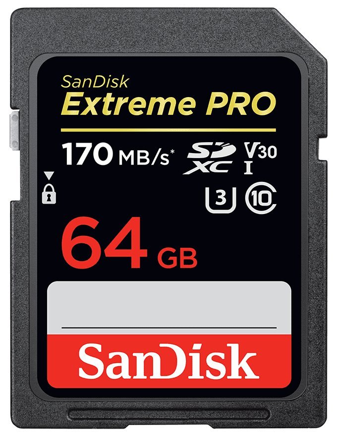 Paměťová karta formátu SDXC nabízí kapacitu 64 GB. Rychlost čtení je až 170 MB/s a rychlost zápisu až 90 MB/s.