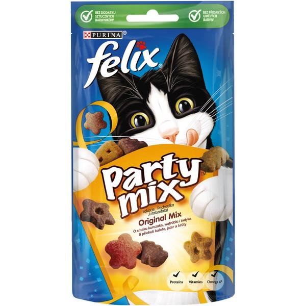Party Mix od Felixe mají oblíbené všechny kočky, co z našeho okolí znám. Nelze tím samozřejmě krmit pravidelně a ve větší míře, ale jako pamlsek je to dobrá alternativa. Existuje několik příchutí, v oblibě u našich koček nevidím rozdíl, tak je kupujeme na střídačku. Pamlsky dostávají z ruky, nebo jim je házíme, aby je chytaly - třeba i v letu s elegantním výskokem. Někdy přidáváme do chytrých míčků - to pak je zábava 2 v 1 - kočky si pohraje s míčkem, vydoluje pamlsky a pochutná si.